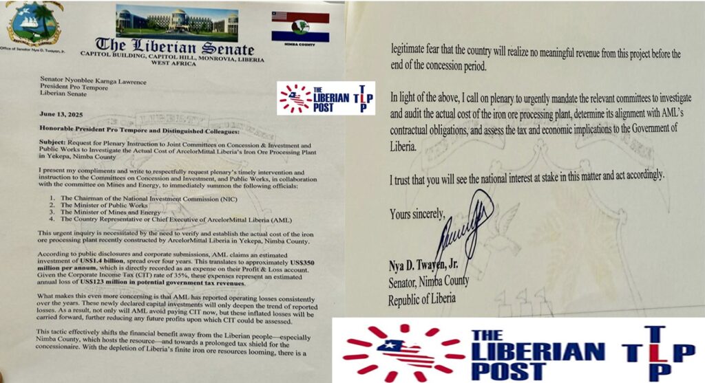 MONROVIA – On Thursday, June 12, 2025, Nimba County Senator Nya D. Twayen wrote his colleagues in the Senate, calling for Legislative investigation into the US$1.4 billion investment revelation made by ArcelorMittal Liberia (AML) for its iron ore processing plant recently dedicated in Yekepa, Nimba County.