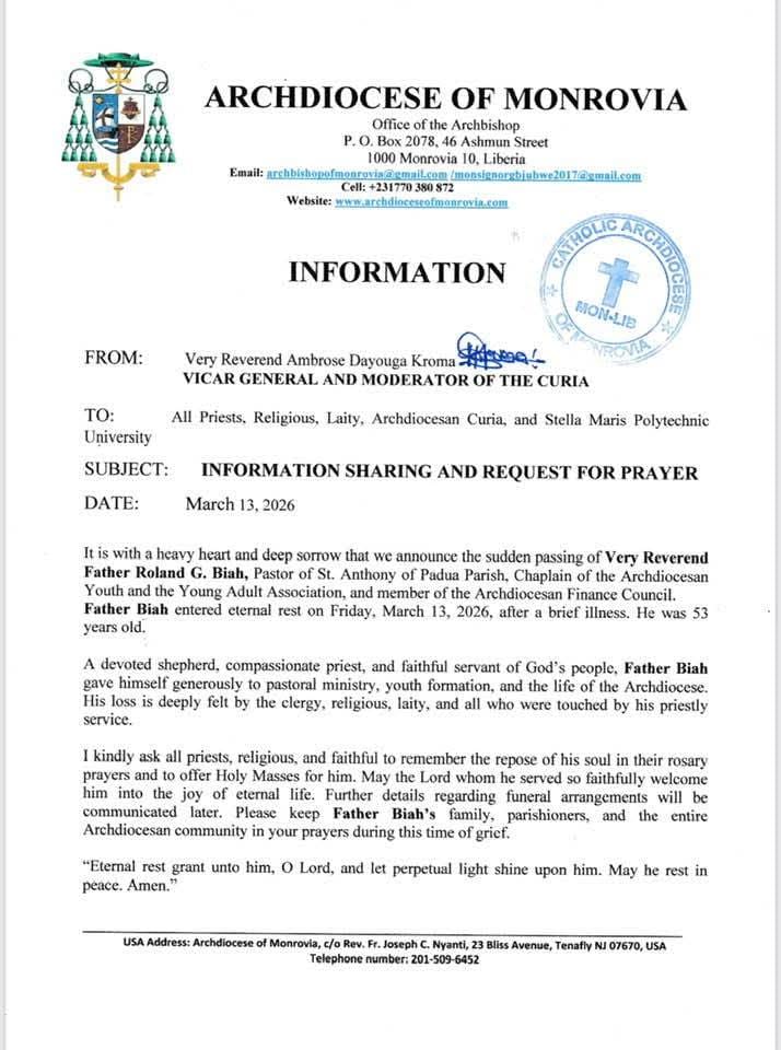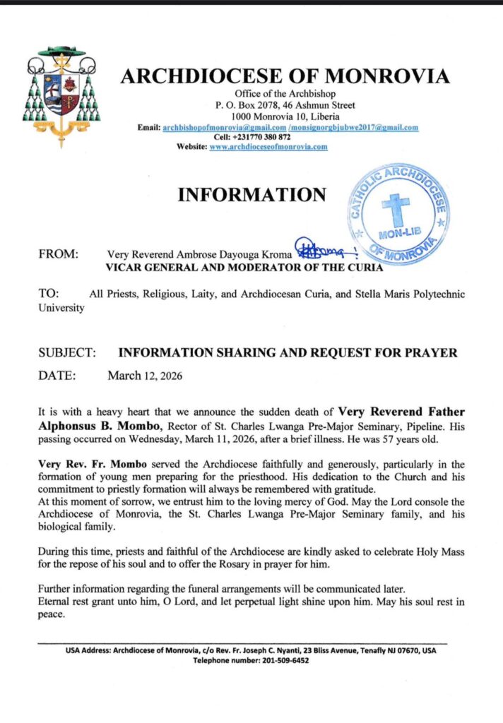 MONROVIA — The Archdiocese of Monrovia is mourning the sudden deaths of two prominent Catholic priests, Very Rev. Fr. Alphonsus B. Mombo and Very Rev. Fr. Roland G. Biah, whose passing within days of each other has left the Catholic community in Liberia in deep grief.