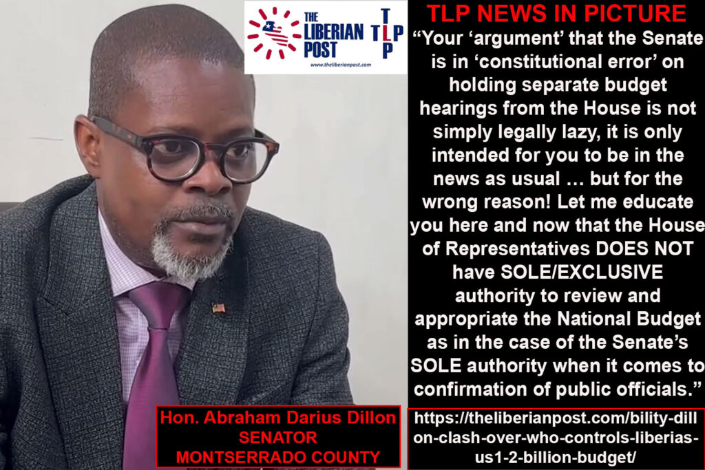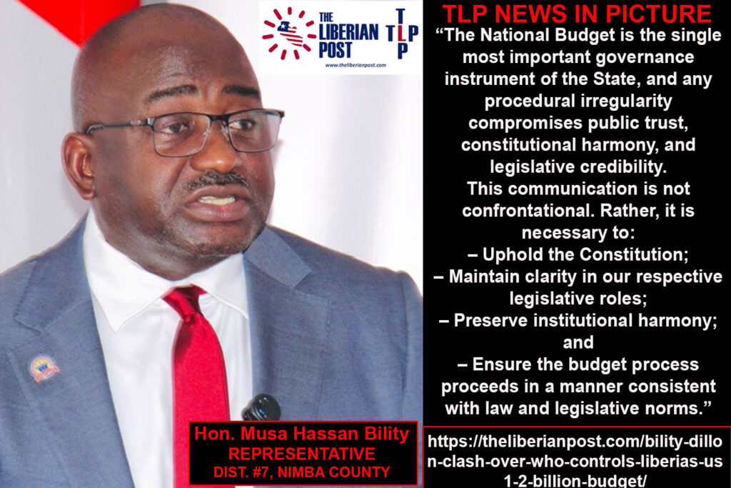 CAPITOL HILL, Monrovia – A fresh constitutional tussle has erupted at the National Legislature over which chamber has the right to take the lead on the US$1.211 billion FY2026 Draft National Budget, with Representative Musa Hassan Bility insisting the Senate must halt its ongoing budget hearings and Senator Abraham Darius Dillon dismissing the argument as “legally lazy” and driven by a desire for attention.