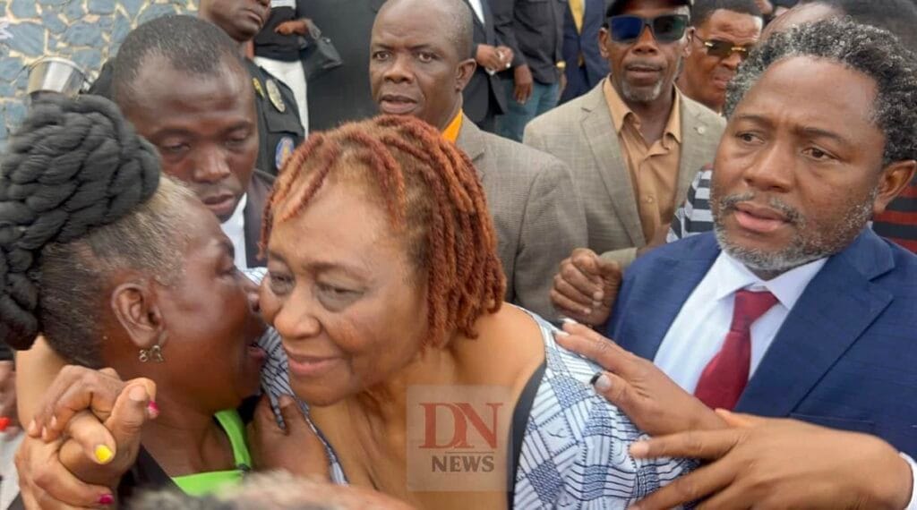 Former Deputy Foreign Minister Mrs. Comfort Sawyer embraces a loved one when she was released from brief detention at the Monrovia Central Prison on Thursday