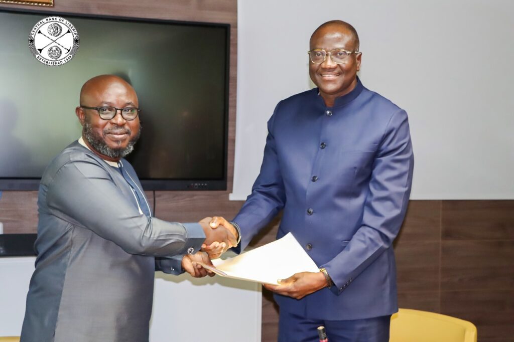 Orange Money CEO and CBL Executive Governor exchange a handshake after the signing