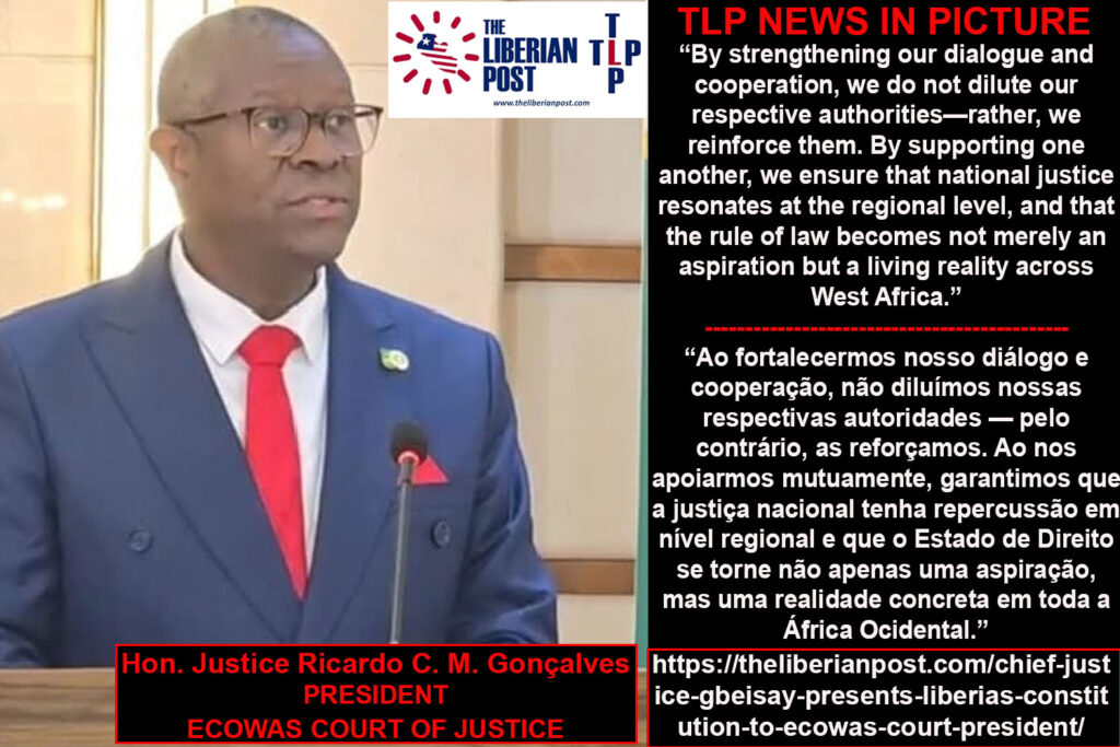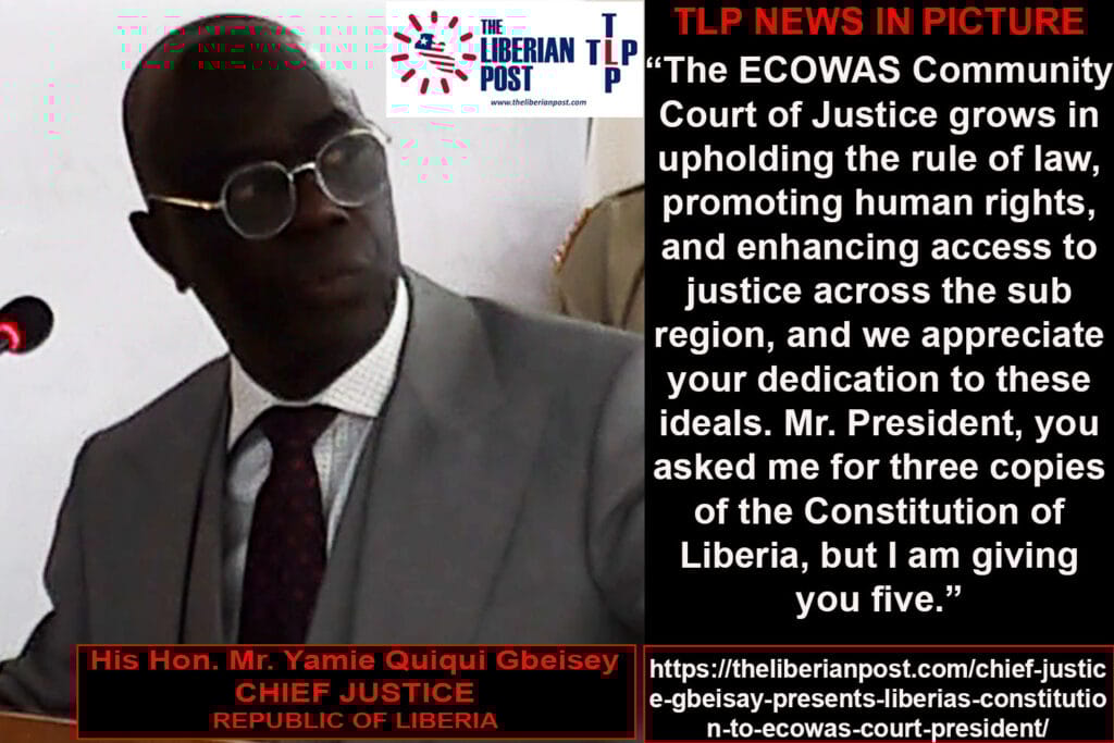 MONROVIA, Liberia — Chief Justice Yamie Quiqui Gbeisay on Friday, November 14, presented five copies of Liberia’s Constitution to the President of the ECOWAS Community Court of Justice, Hon. Justice Ricardo Cláudio Monteiro Gonçalves, as Liberia’s highest court hosted a judicial dialogue aimed at tightening collaboration between regional and national courts.