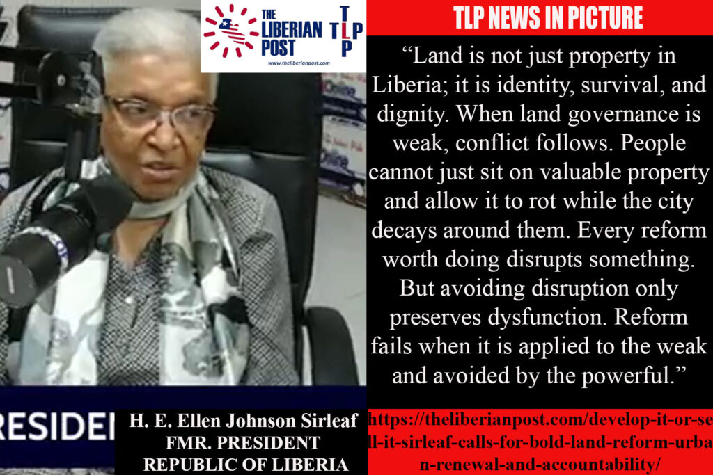 MONROVIA, Liberia — Former President Ellen Johnson Sirleaf has renewed calls for sweeping land reform, stricter accountability, and decisive action on urban decay, warning that unresolved land disputes and abandoned properties continue to undermine Liberia’s development and social cohesion.