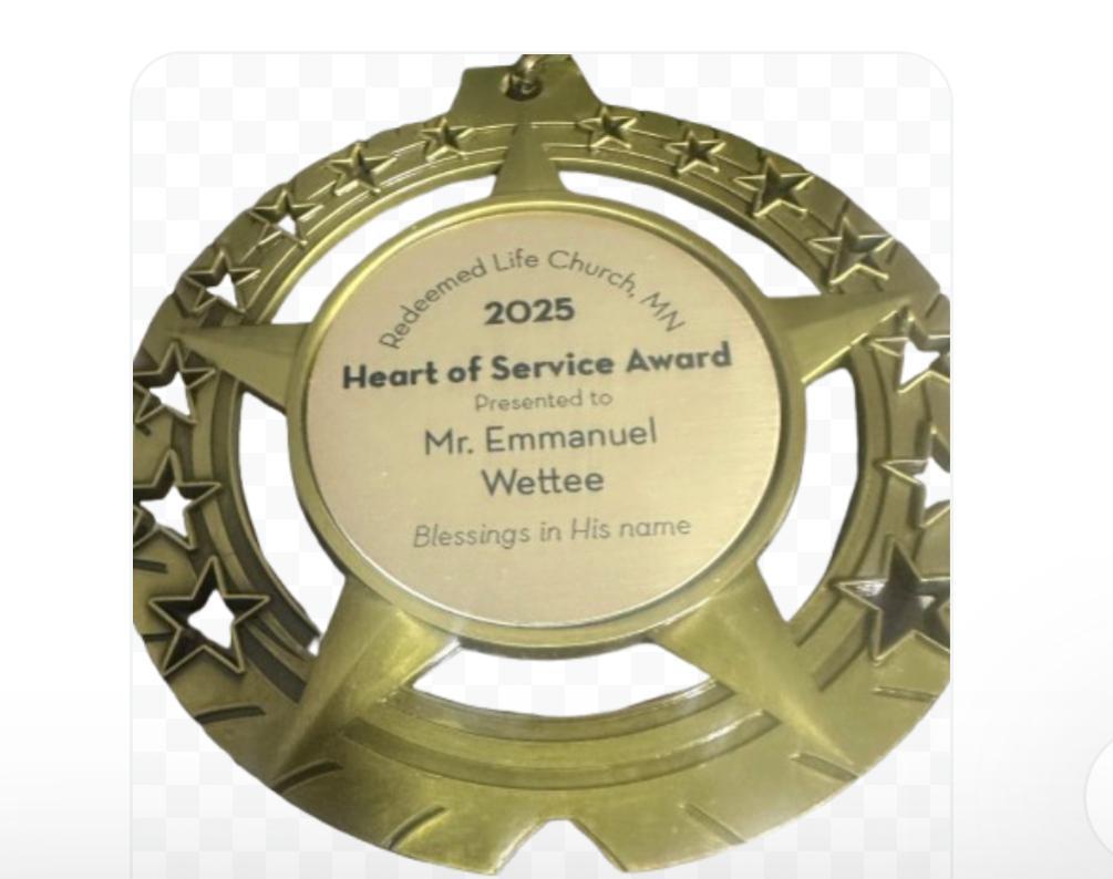 Mounds View, Minnesota — At its 20th Anniversary Thanksgiving Service, Redeemed Life Church International in Mounds View, Minnesota, presented Eminent Emmanuel S. Wettee with the “Heart of Service Award” in recognition of his lifelong advocacy for Liberians on Temporary Protected Status (TPS), Deferred Enforced Departure (DED) in the US and Dual Citizenship in Liberia, for natural born Liberians and those born of Liberian parentage.