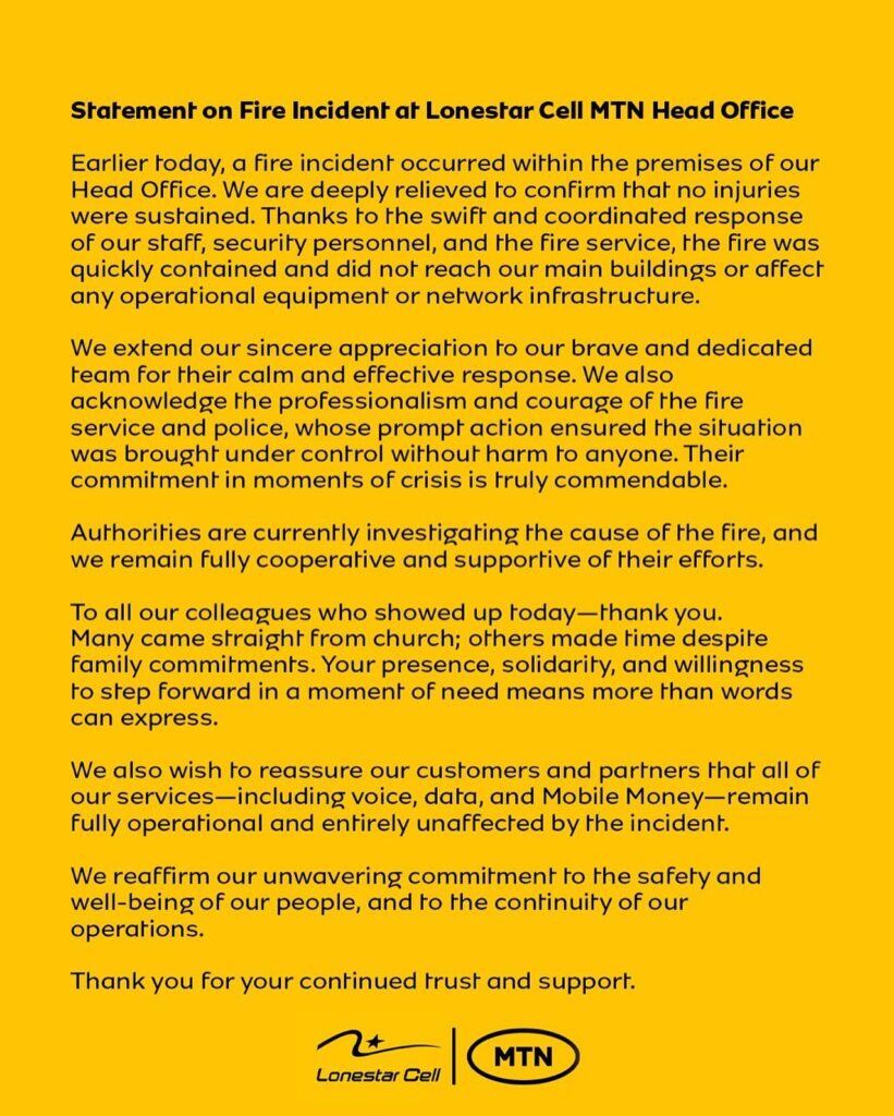 MONROVIA, Liberia — Lonestar Cell MTN has confirmed that a fire incident occurred early Sunday morning at its headquarters in Congo Town, prompting a rapid emergency response from staff, security personnel, and the Liberia National Fire Service.
