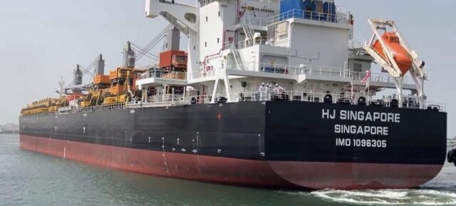 The vessel, HJ Singapore, berthed at the Freeport of Monrovia with the 137 pieces of earth-moving equipment on board