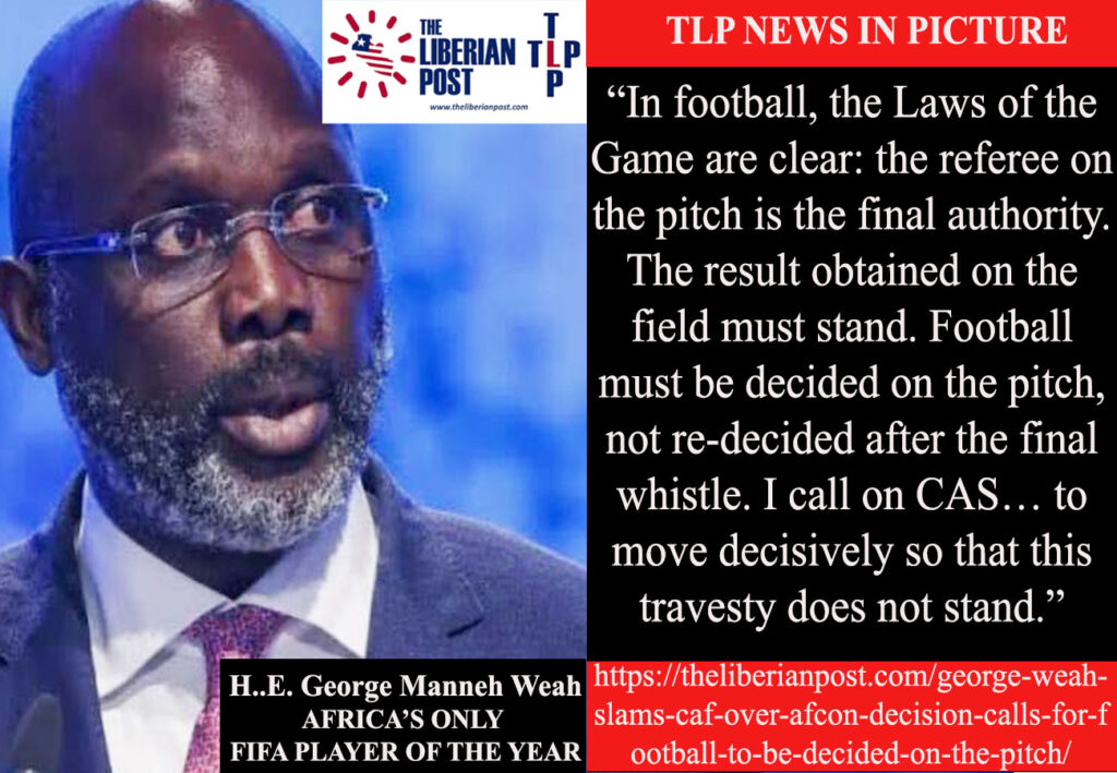 MONROVIA — Liberia’s football icon and former President, George Manneh Weah, has strongly criticized the Confederation of African Football (CAF) over its controversial decision to strip Senegal of the AFCON 2025 title and award it to Morocco, warning that the move undermines the integrity of the game.