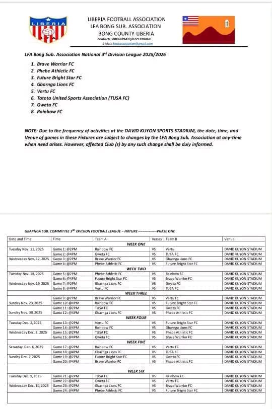 Gbarnga, Bong County — The Liberia Football Association (LFA) Bong Sub-Association has officially unveiled the fixture schedule for the 2025/2026 National 3rd Division League.