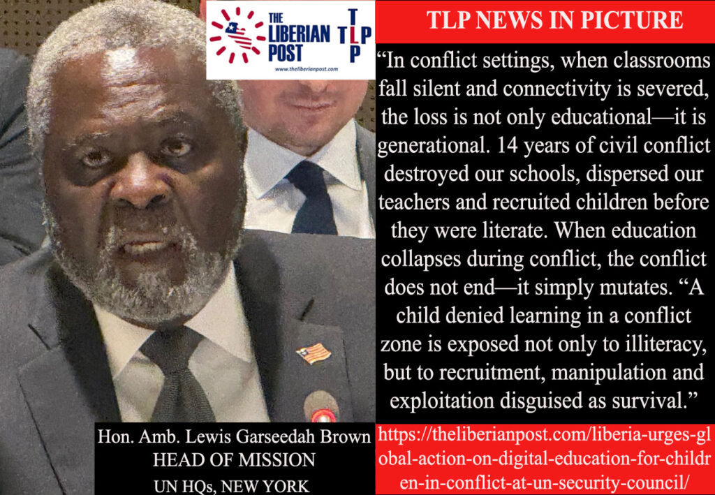 NEW YORK — Liberia has called on the international community to treat access to education and technology for children in conflict zones as a critical component of global security, warning that the collapse of learning systems during war can fuel instability for generations.