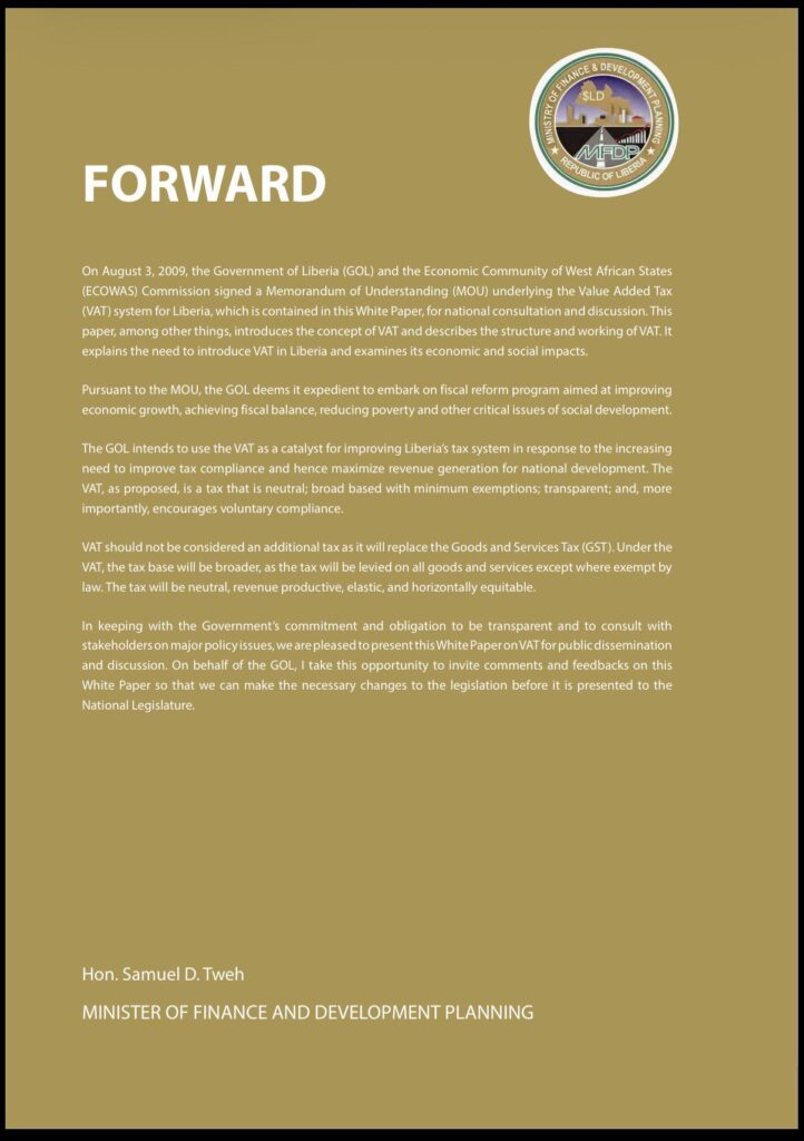 VAT is expected to replace the Goods and Services Tax (GST) and is designed to modernize Liberia’s tax system, improve compliance, broaden the tax base, and enhance domestic revenue generation.