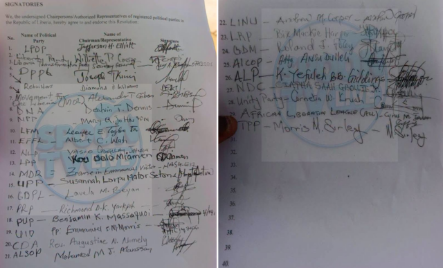 Among the political institutions listed in the signed document are the Liberia People’s Democratic Party (LPDP), Liberty Party, Liberia Transformation Party, People’s Democratic Party of Liberia (PDPL), Movement for One Liberia, National Democratic Coalition (NDC), Liberia National Union (LINU), Liberia Restoration Party (LRP), African Liberation League (ALL), and several others.
