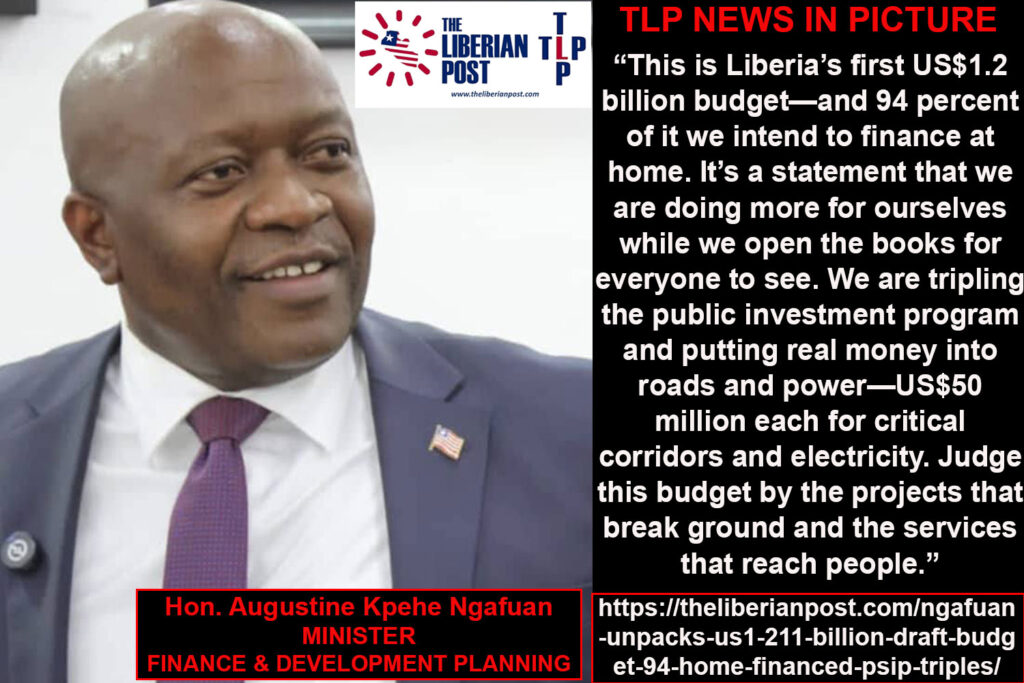 MONROVIA, Liberia — Finance and Development Planning Minister Augustine Kpehe Ngafuan on Monday detailed Liberia’s first-ever US$1.211 billion draft national budget, saying 94% of spending will be financed domestically as the government triples its Public Sector Investment Program (PSIP) and channels a US$100 million boost to roads and energy.