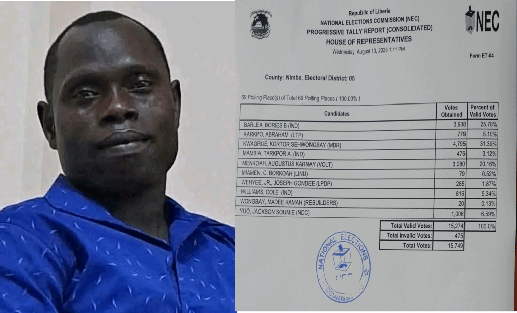 After the political debates and arguments over whether Vice President Koung and Senator Kogar distanced themselves from the candidate of the Movement for Democracy and Reconstruction (MDR) in the just held Nimba County Electoral District #5 By-election, the National Elections Commission (NEC) has declared Korto Sehwongbay Kwagrue of MDR as the winner of the hotly contested Nimba County District #5 Representative by-election.