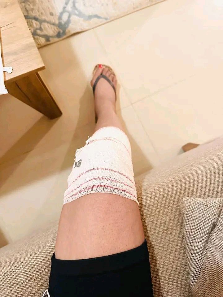 A leg wrapped in bandage and it is said to be belonging to the late Toni, Sam’s wife; folks are said it was as a result of domestic violence