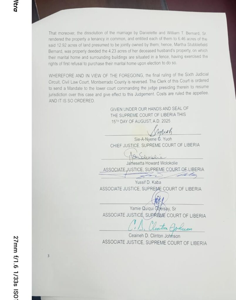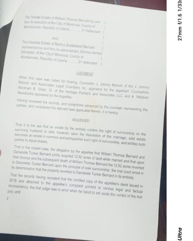 MONROVIA – The Supreme Court of Liberia has reversed the ruling of the Sixth Judicial Circuit Civil Law Court concerning a property case related to the intestate estate of the late William Thomas Bernard and his widow, Danilette Tucker Bernard, the land is situated where the headquarters of the Congress for Democratic Change (CDC) is located.