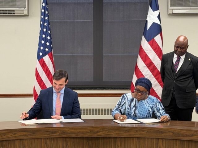 Foreign Minister Sara Beysolow-Nyanti and U.S. State Department’s Jeremy P. Lewin, Under Secretary for Foreign Assistance, Humanitarian Affairs, and Religious Freedom, signing the MOU on behalf of their respective countries