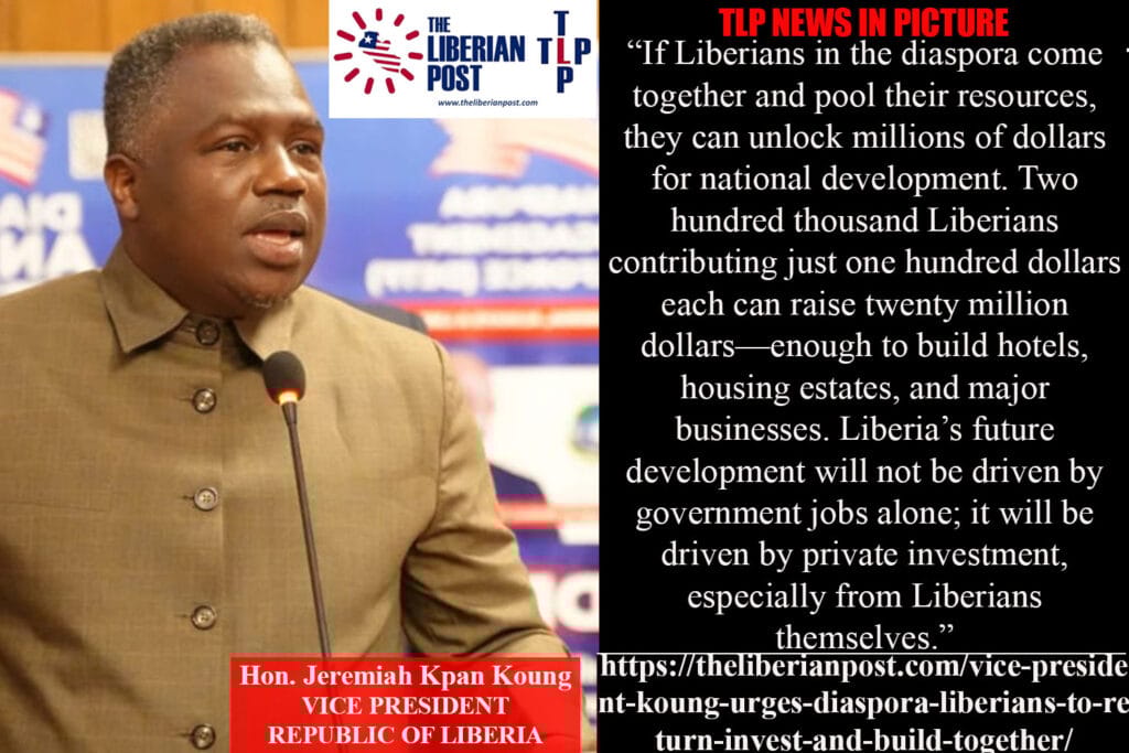 MONROVIA, Liberia — Vice President Jeremiah Kpan Koung, representing President Joseph Nyuma Boakai, on Friday, December 12, delivered a strong call to action to Liberians in the diaspora, urging them to return home, pool resources, and invest collectively in Liberia’s private sector as a pathway to national transformation.